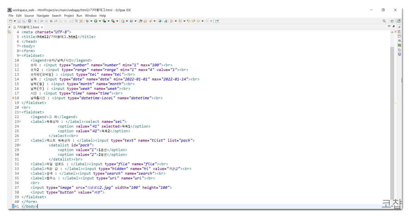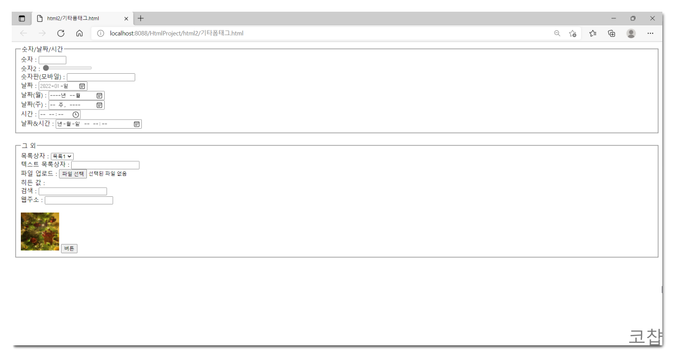 그리고 목록상자는 selected를 넣어 기본값으로 목록1이 설정되게 했으며, 텍스트 목록상자는 위에서 말했듯 list와 datalist의 값이 같아야 한다. 파일 업로드와 검색도 있고, 작성은 되지만 보이지 않는 히든값, 주소 형식으로만 입력 가능한 url 태그도 있다. submit과 다르게 button은 클릭만 되며, 이미지를 삽입하면 클릭 시 submit이 된다.