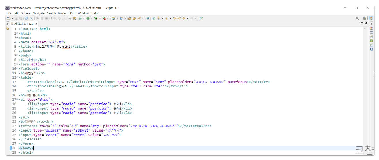 다른 태그들도 중요하지만 form 태그 같은 경우에는 이것저것 연습을 많이 해보는 게 좋다. 그래서 여러 가지 태그를 종합하여 아래의 지원서 폼을 작성했다.