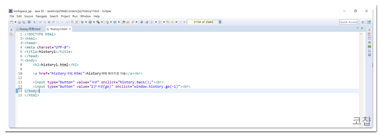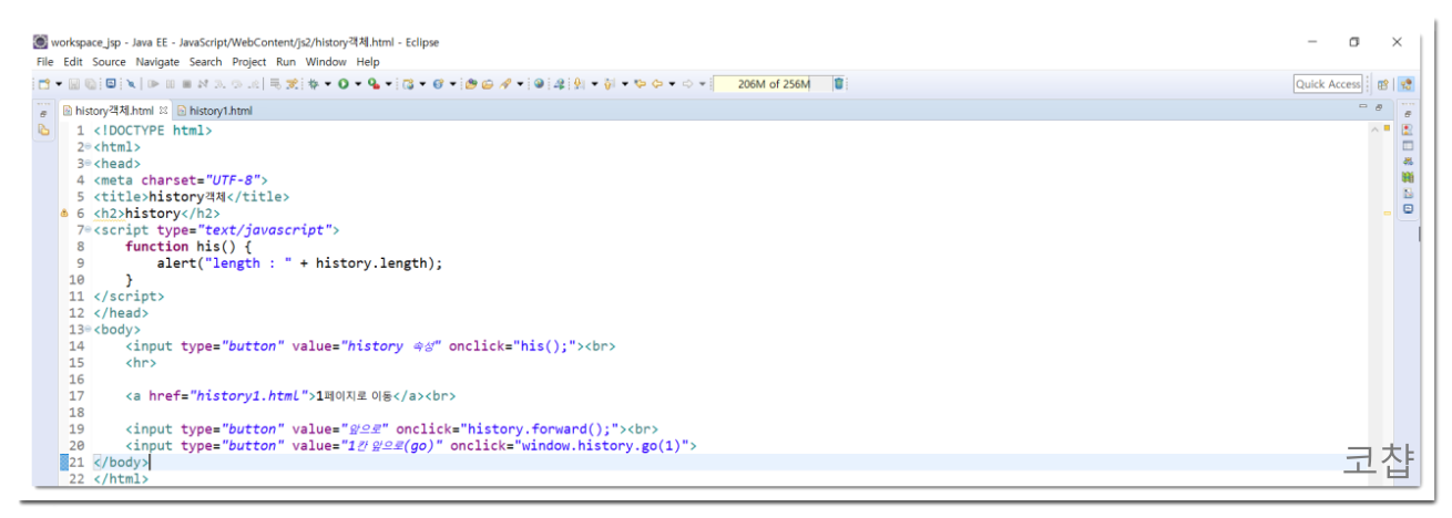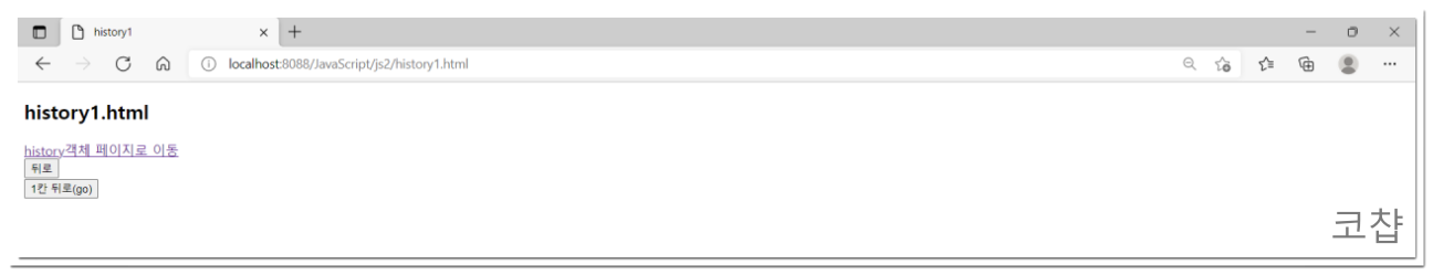 history 객체는 페이지 이동의 과거력을 나타내며, 속성으로 히스토리 길이(history.length)가 있다. 기능으로는 history.back(), history.forward(), history.go(숫자) 가 있는데, 각각 뒤로 가기, 앞으로 가기, 숫자(length)만큼 뒤로 또는 앞으로 가기를 말한다. 이 객체에서는 history.length가 1일 때, 즉 페이지 이동이 없었을 때는 갈 페이지가 존재하지 않기 때문에 기능을 쓰지 못한다. 아래 코드는 두 페이지를 연결해서 작성한 예시다.