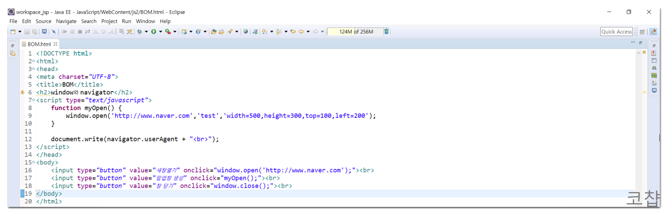 JS의 여러 객체 중 브라우저를 표현하는 브라우저 객체 모델(BOM;Browser Object Model), 문서 구조를 표현하는 문서 객체 모델(DOM;Document Object Model)이 있다. 그중 BOM은 계층형 구조라서, 최상위 객체인 window 밑에 location, history, navigator 등의 객체를 말한다. 이 window의 하위 객체들을 쓸 때는 window 코드를 생략하는 것도 가능하고, BOM 역시 onclick 이벤트로 사용할 수 있다.