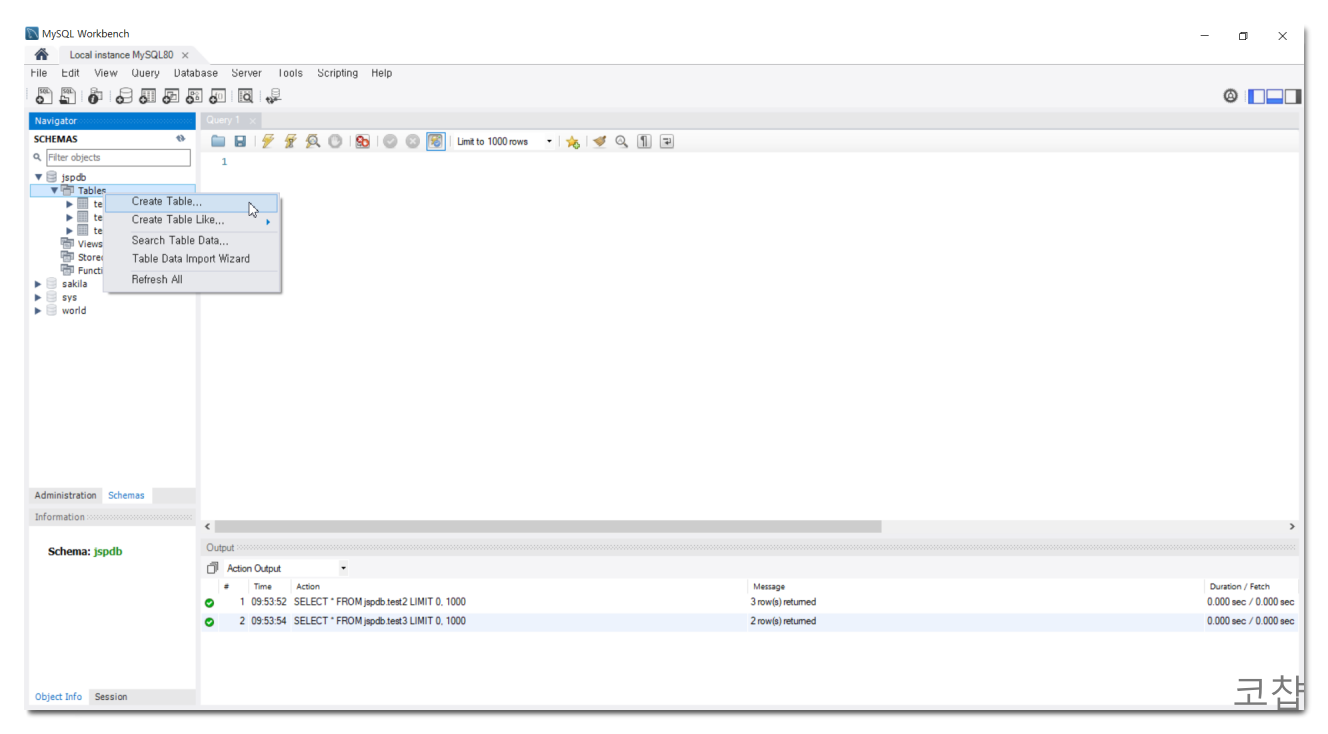 DB 연결을 하려면 사용할 DB가 있어야 한다. 전에 만들었던 jspdb에 새로운 테이블을 만들건데, 이번엔 워크벤치를 사용한다. 워크벤치에 로그인하여 내 db - Tables를 우클릭, create table을 누른다.