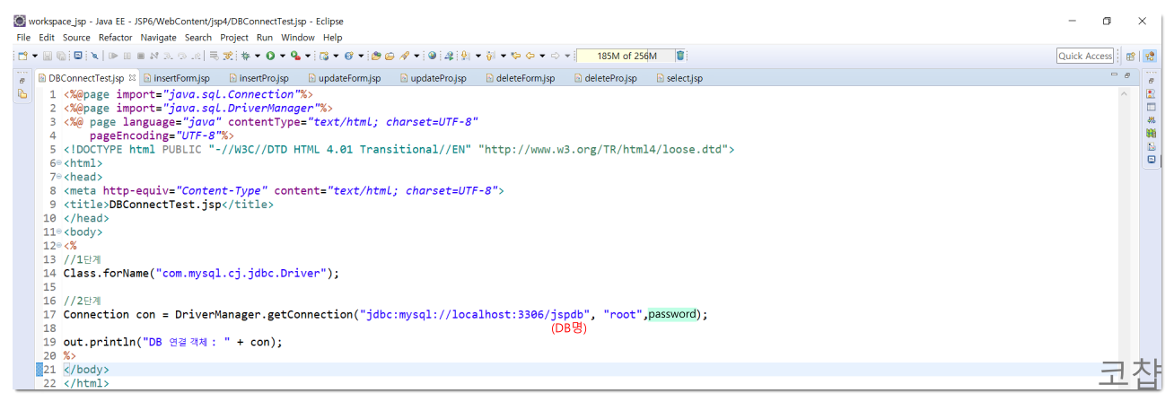 이제 이클립스에서 DB 연동 코드를 작성한다. 1단계는 드라이버 로드, 2단계는 내 DB 연결이다.
