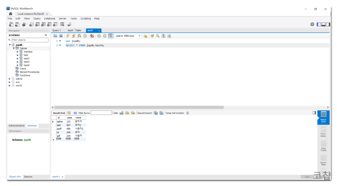 select문으로 데이터를 꺼내기에 앞서 insert문이나 워크벤치를 이용하여 데이터를 몇 개 저장했다. 참고로 id는 PK(primary key)를 설정했기 때문에 중복이나 null이 불가능하다.