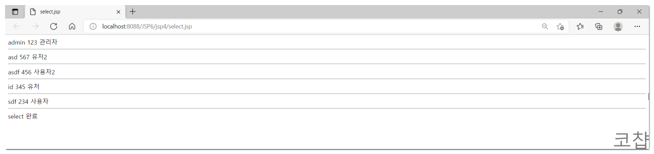 다른 update문이나 delete문도 쿼리 작성만 다를 뿐 모든 과정이 똑같다. 물론 물음표는 개수에 맞게 채워야 한다. 하지만 select문은 방식이 좀 다르다. CRUD의 insert, update, delete문은 테이블 데이터를 변경시키는 작업이고 select문은 데이터를 선별하여 가져오는 것이기 때문에, 전달받을 값이 없으며 작성 코드 또한 다르다.