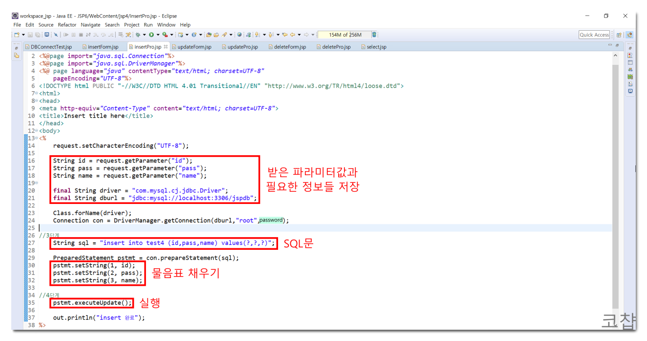 아래 Pro 페이지에서 전달받은 값을 저장하고 쿼리를 작성한다. insert문으로 id, password, name 값을 테이블에 넣는 것인데, values() 안에 ?를 적은 것은 보안을 위해서다. 물음표 없이 바로 정보를 적어버리면 DBMS로 전달되는 과정 중에 쿼리가 그대로 노출돼서 위험해진다. 이 ?들은 pstmt.set타입(물음표번호, 데이터) 으로 채우고 실행한다.