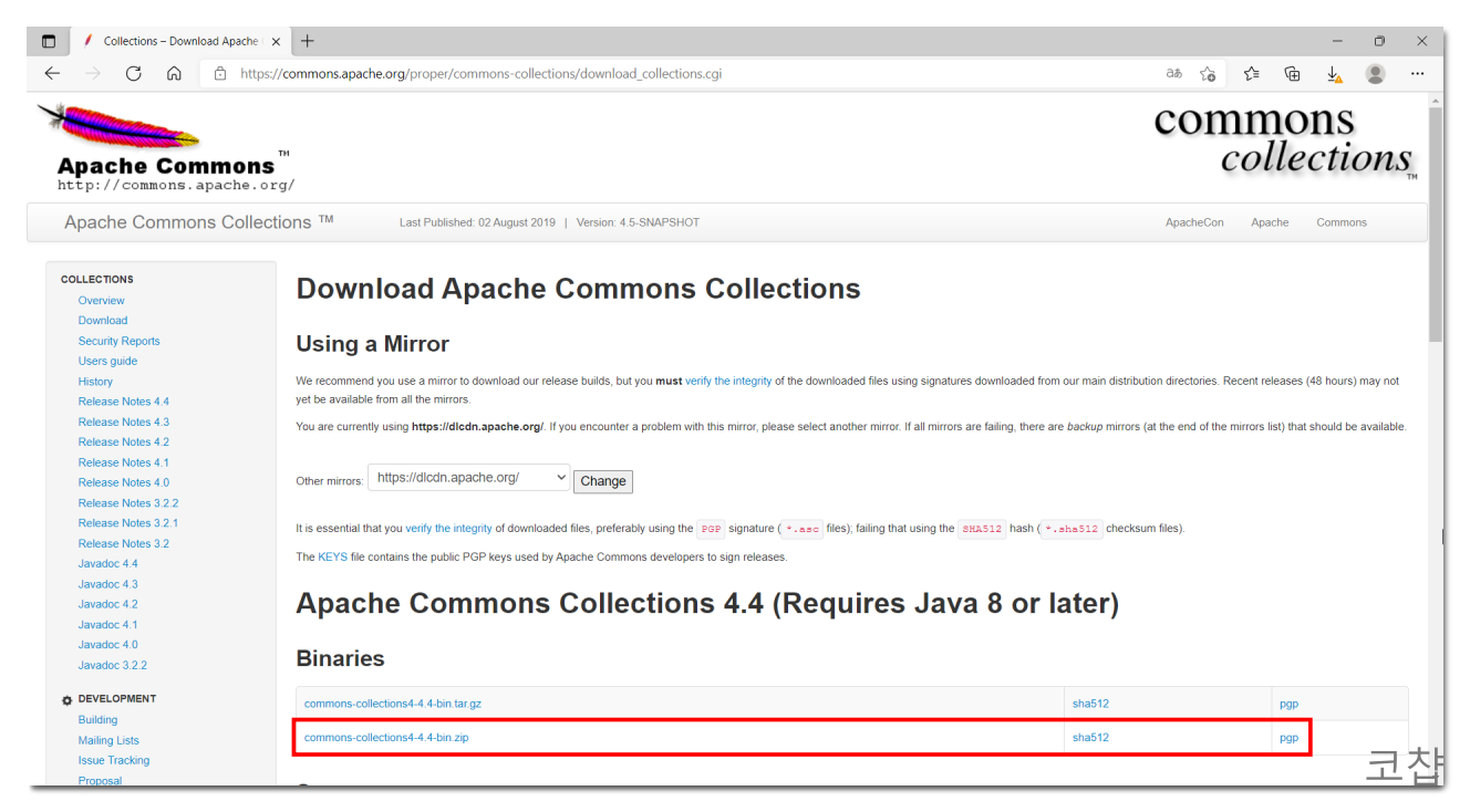 클릭했을 때 COLLECTIONS와 DBCP는 Binaries에 바로 보이는 bin.zip 파일을 다운로드한다.