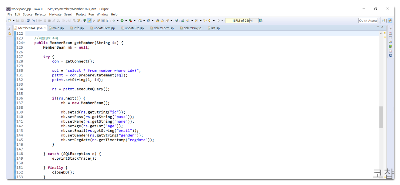 이렇게 하면 JDBC, 자바빈 객체(memberBean/memberDAO), 커넥션 풀, JNDI를 모두 사용하여 DB(MySQL)에 연결을 해본 것이다. 이것은 비즈니스 로직과 디자인을 분리하는 방법들 중 Model1 방식이다. 구현하기 쉽지만 이후 유지보수가 어려워서 잘 쓰이지 않고, 후에 배울 Model2나 MVC 패턴이 대부분의 웹상에서 쓰이고 있다.
