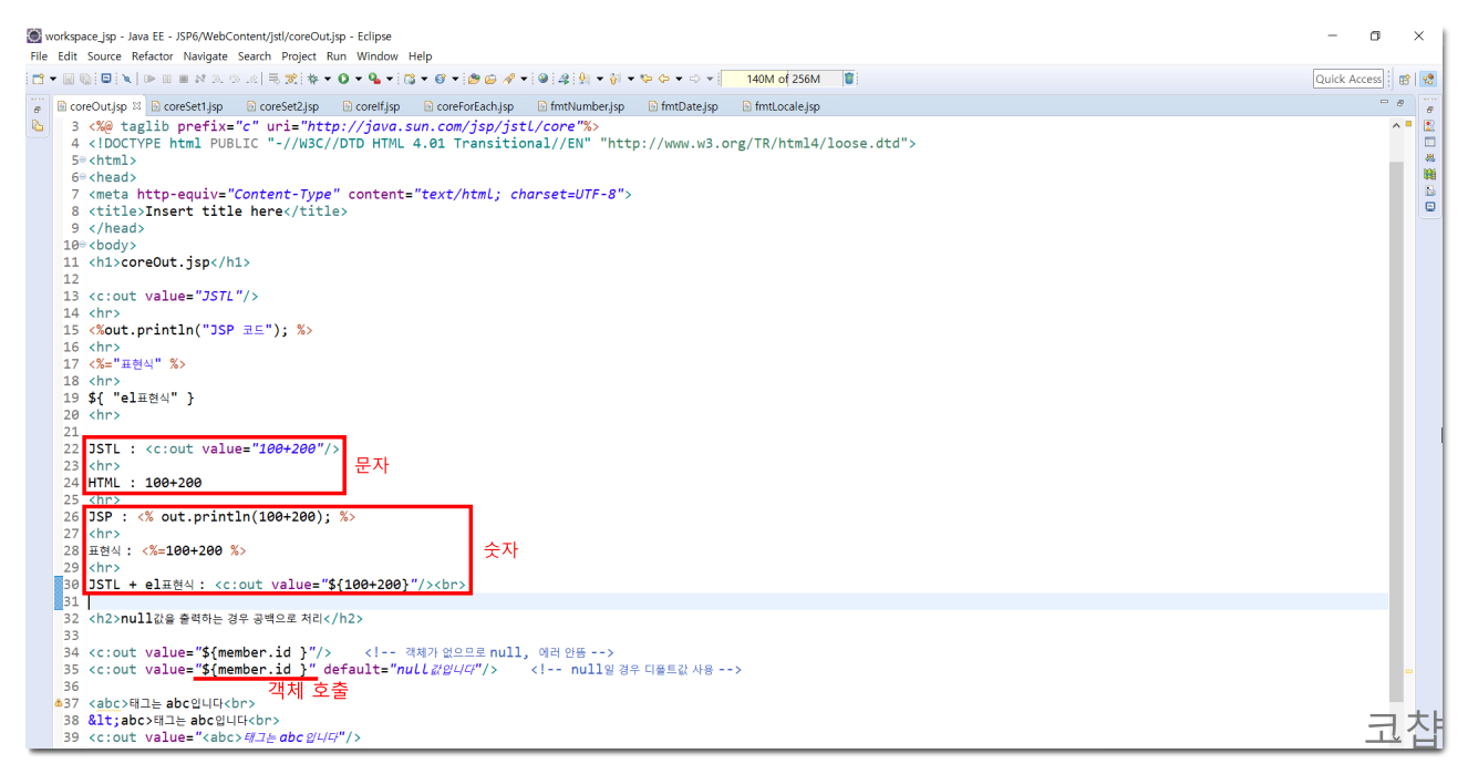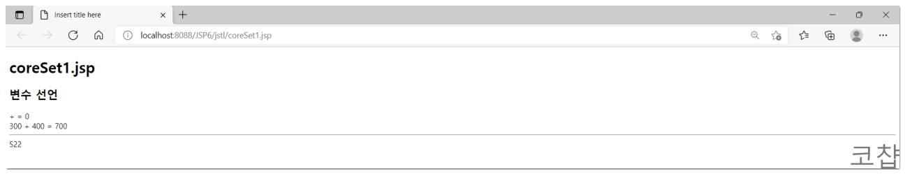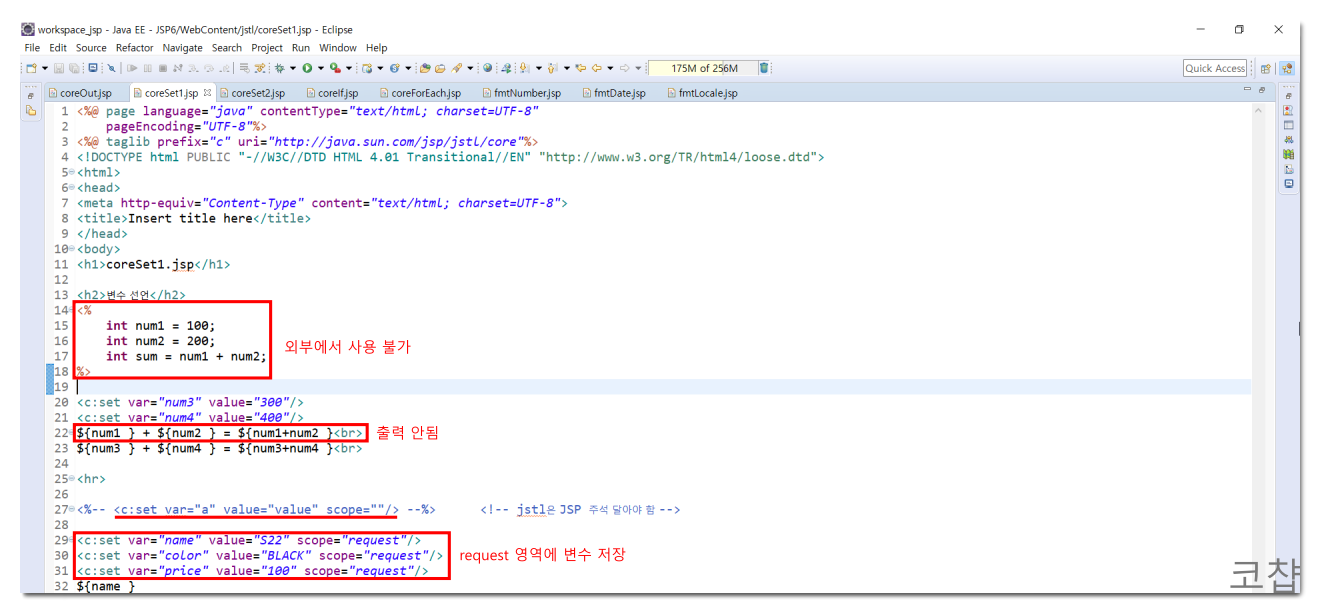 var에 변수명, value에 값을 적어 저장한다. 영역(scope)을 생략하거나 빈 상태로 두면 자동 page 영역이 지정되고, 영역 순서는 page - request - session - application 이다. 참고로 JSTL도 jsp와 비슷해서 jsp 주석을 써야 한다.
