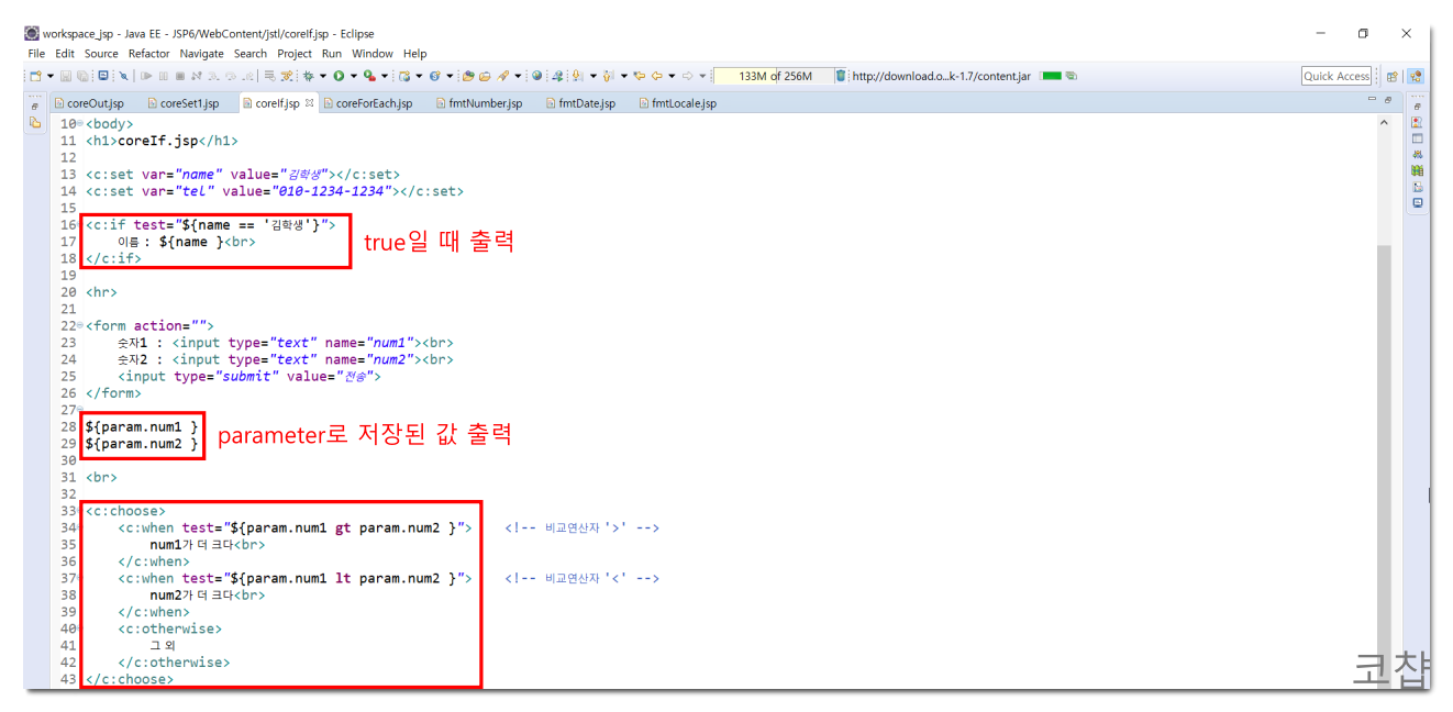 if는 단일 조건, choose는 switch-case문과 같고, else가 없기 때문에 여러 조건을 확인해야 하면 choose를 쓴다. test 결과가 true일 때 코드가 실행되며, choose 태그 안에 when 태그로 조건을 지정한다. 여기서 gt, lt는 태그처럼 생겨서 헷갈릴 수 있는 비교연산자를 대신한다. 참고로 <form>에서 액션 페이지가 없으면 본인 페이지를 호출한다.
