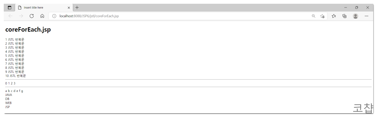java의 for문과 형태가 비슷하다. items에 배열 등을 넣어서 begin/end 없이 쓰면 모든 값을 출력(inhanced for문)할 수도 있다. forTokens는 items로 문자열을 받아서 delims에 지정된 기호로 문자열을 잘라 출력한다.