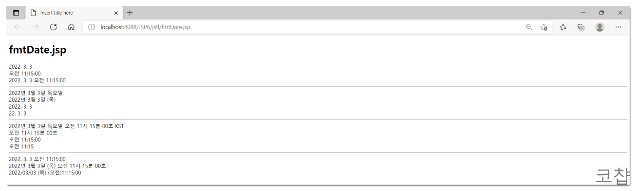 fmt 중 date는 날짜/시간에 관한 것이다. type은 날짜, 시간, 모두 중 선택, dateStyle이나 timeStyle은 출력 길이, pattern은 출력 형식을 임의로 지정한다.